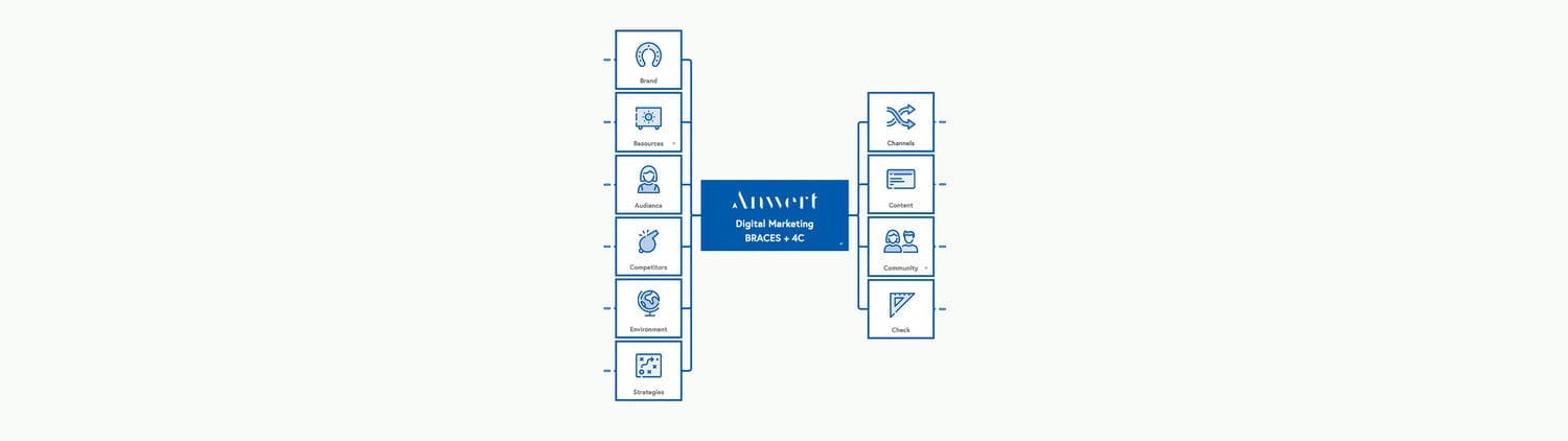 Digital Marketing (Strategies) is a very broad concept. Especially, when you are not working in this field every day, it can quickly feel overwhelming. To help my clients and me see the bigger picture including all the opportunities and necessities I start every project by presenting a mind map that gives a clear overview of what needs to be considered before and while doing digital marketing. We then use a copy of that mind map as a checklist to keep track of what we already thought about and what still needs to be considered. The final result is a clear vision of what the client’s company currently stands for, where it wants to go, and what needs to be done to get there.