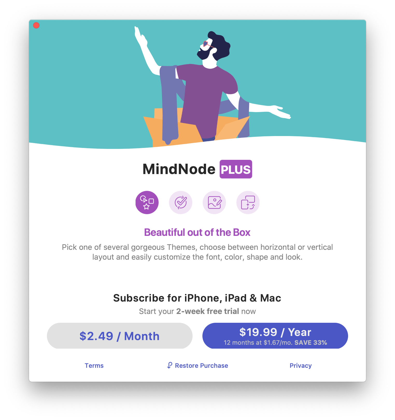 MindNode 7 is a free update for existing customers. New customers can unlock our full feature set with our new cross-platform MindNode Plus subscription.
