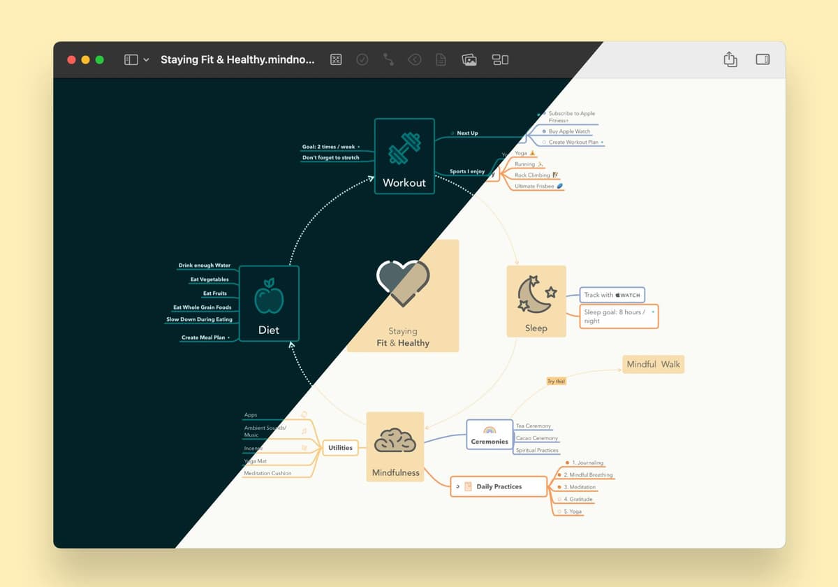 Switch MindNode from dark to light mode to suit your working patterns and prevent eye strain. MindNode can adjust automatically to your macOS System Settings if you wish so.