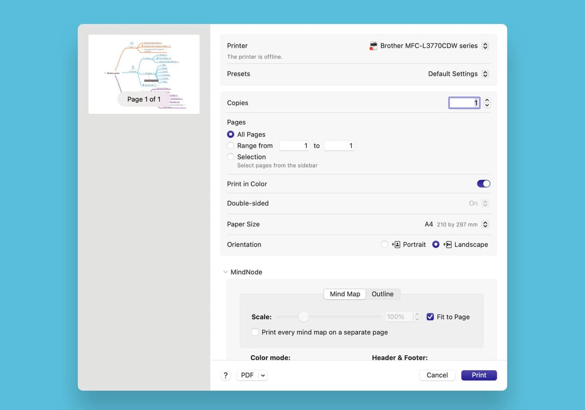Want to take things off-screen? MindNode makes printing projects quick, slick, and easy.