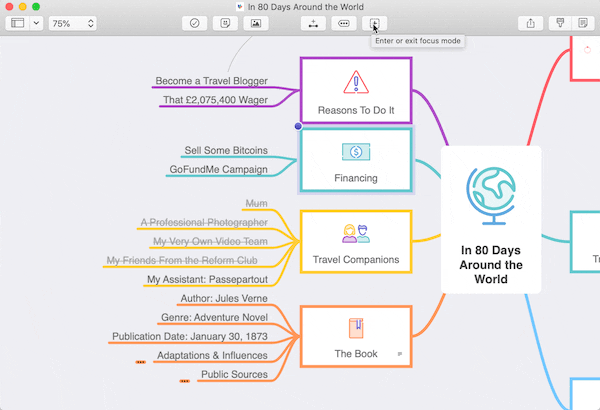 But there is more! Ideas are unpredictable, and you can never know when inspiration will hit you. To that end, we made it easy to refocus on a different part of the mind map. With Focus Mode you can always follow your train of thought.