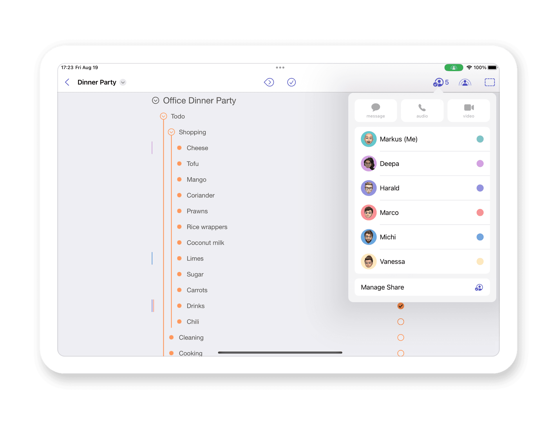 Seven years ago, we started actively thinking about adding a collaboration feature to MindNode. We explored collaboration technologies, did hack weeks to write prototypes, and began to adapt our codebase. When we started working on our new outline mode we designed it with collaboration in mind, and we have been using it to collaborate on the same document for some time now.