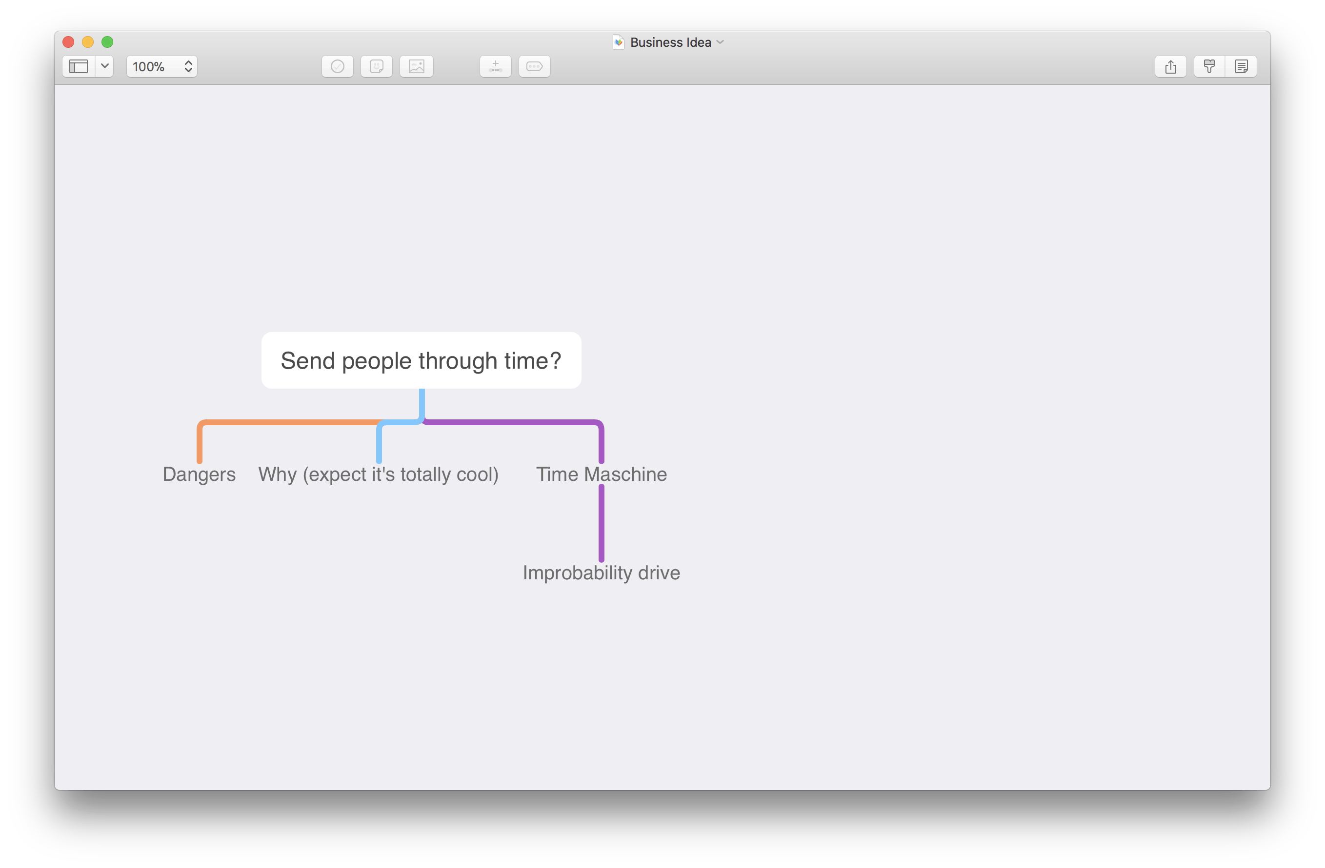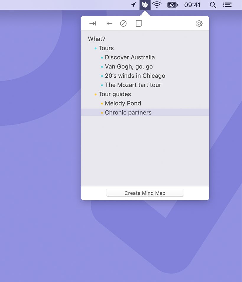 Start your brainstorming process by collecting thoughts directly in your main menu, even when MindNode is not running. When you are ready convert them to a mind map to further develop your idea.