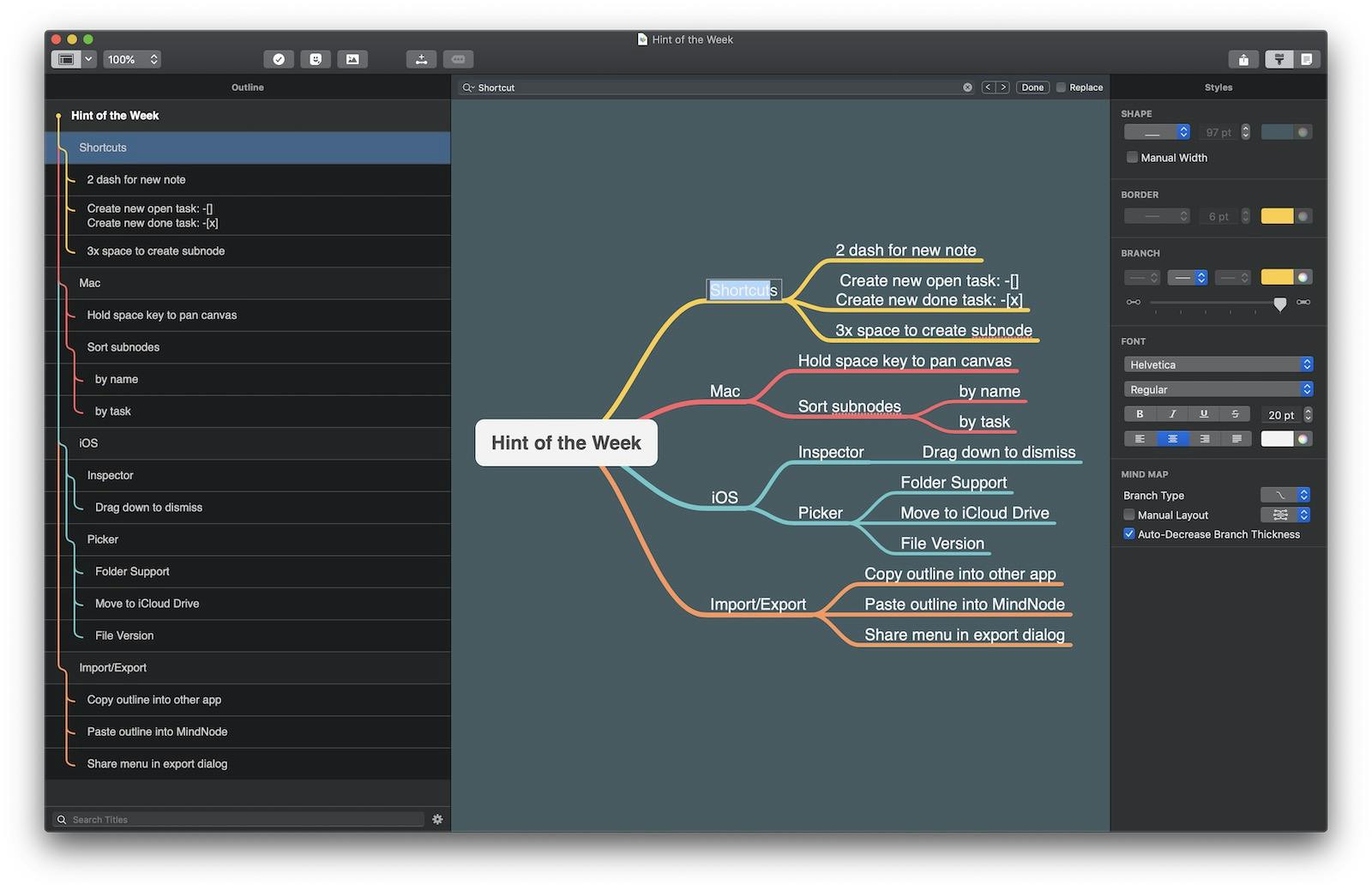 All new lightweight design that is a perfect fit for iOS 11 and the brand new iPhone X. Collapsed panels allow easy access to important shortcuts. Expanded panels host inspector, outline and the all new actions panel. The actions panel gives access to new and relevant actions like "Sort Subnodes Alphabetically", "Zoom to Fit", and "Add new parent node".