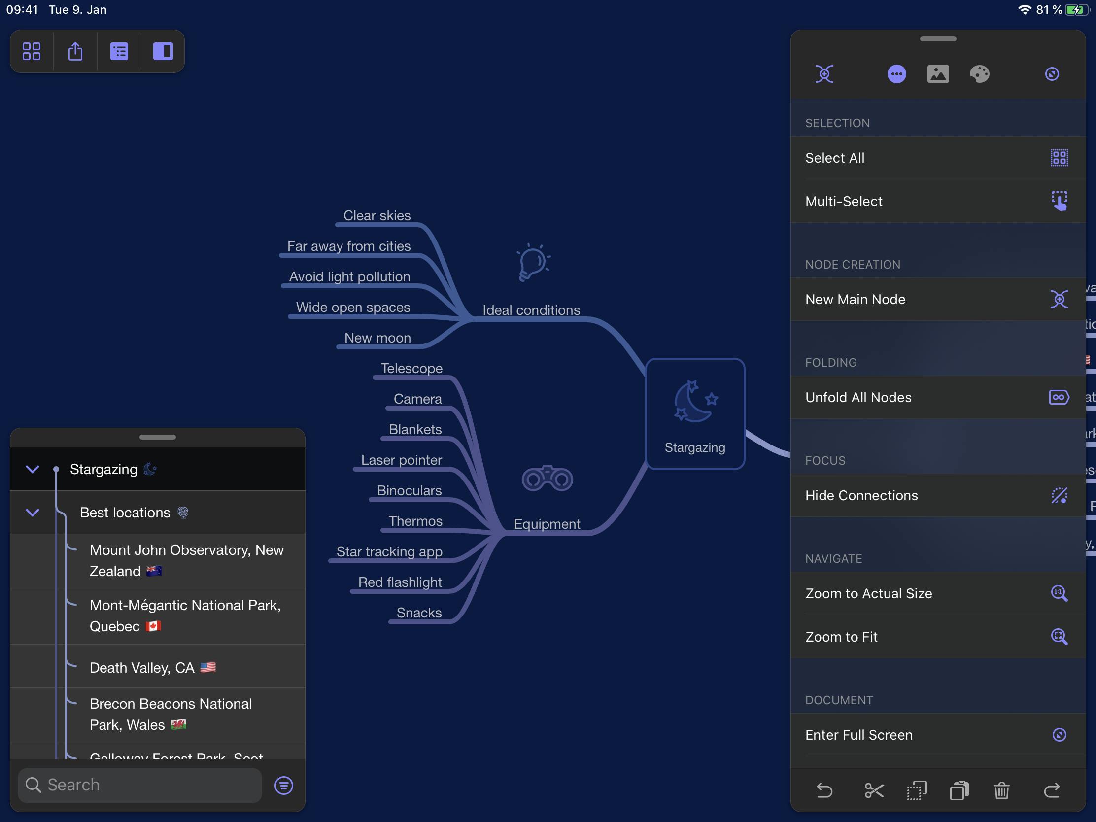 We've updated our iPad version to allow opening multiple documents. Open two MindNode documents side by side to work on them simultaneously. We also extended support for multiple documents to Quick Entry, which now supports multiple drafts.