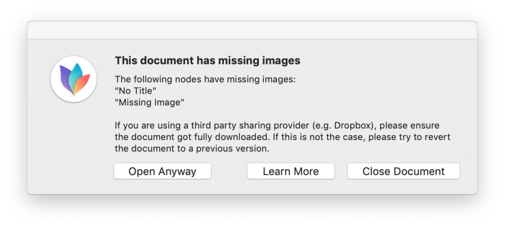 If you are seeing this error message when trying to open a MindNode file, some assets of the document got lost since last saving the document. Those assets can be images, stickers, PDFs or cross connections.